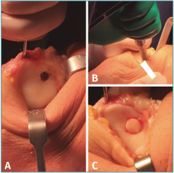 Figura 4. Técnica quirúrgica del cilindro osteocondral simple. A: preparación del lecho en el sitio receptor; B: liberación del injerto osteocondral de forma perpendicular al lecho de la lesión desde el extractor de cilindros osteocondrales; C; resultado final, con cilindro osteocondral simple a nivel de la superficie articular circundante y firme mediante fijación por presión.