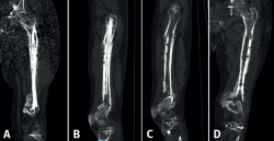 Figura 3. En las imágenes A y B puede observarse la consolidación de la fractura en el fémur proximal. En las imágenes C y D se aprecia la consolidación proximal de la fractura del fémur, así como la consolidación parcial viciosa en el fémur distal. Debido a las consolidaciones que se muestran, no se aplicó ningún método de estabilización entre una cirugía y otra.