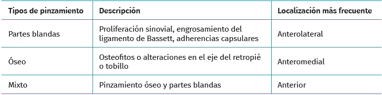 El PAT se define como dolor y/o limitación del rango de movilidad que aparece con la dorsiflexión del tobillo, debido a la presencia de tejidos blandos u óseos que se interponen entre las superficies articulares. Se distingue entre un pinzamiento de partes blandas (proliferación sinovial, engrosamiento del ligamento de Bassett, adherencias capsulares), óseo (osteofitos o alteraciones en el eje del retropié o tobillo) (Figura 1) o mixto (Tabla 1). El PAT se puede subdividir en pinzamiento central, anterolateral y anteromedial(8), siendo los dos primeros los más frecuentes(9). El PAT anterolateral suele ser de partes blandas, mientras que el anteromedial suele producirse por conflicto de espacio entre osteofitos del cuello talar y anteriores al maléolo medial en dorsiflexión(9,10). El PAT es la causa más común de dolor en la parte anterior del tobillo que empeora con la dorsiflexión. No obstante, el pinzamiento posterior puede ser más frecuente en ciertos grupos de pacientes, como bailarines o futbolistas, debido a la repetición de movimientos en flexión plantar forzada(4).
