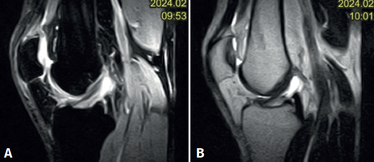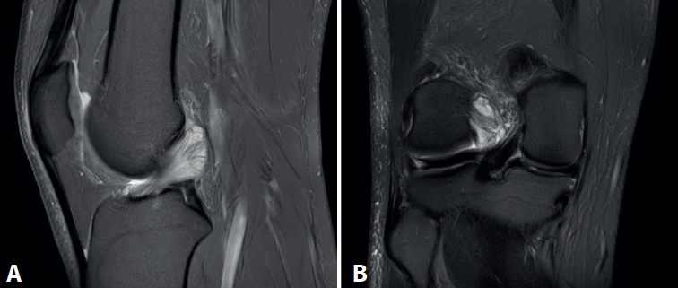 Figura 2. Imagen de resonancia magnética del quiste sinovial localizado en el ligamento cruzado anterior en cortes sagitales. A: secuencia DP FS en corte sagital de la rodilla; B: secuencia DP T1 en corte sagital de la rodilla.