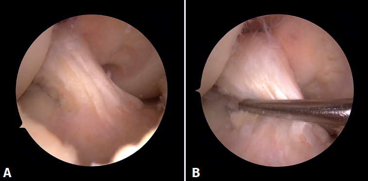 Figura 5. Visión artroscópica desde el portal anterolateral. A: tras el desbridamiento se observa que no existe pinzamiento del espacio articular femorotibial lateral en posición “de cuatro” a 90° de flexión; B: palpación de la tensión del remanente del ligamento cruzado anterior.
