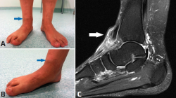 Figura 1. En el contexto mecánico de un pie plano valgo, el tendón tibial anterior tiene que intentar frenar en acción excéntrica la pronación tarsiana. Con frecuencia sufre roturas degenerativas por este motivo. A: imagen clínica de un paciente con pies planos y rotura espontánea del tibial anterior. La flecha señala el muñón proximal del tendón en la región retinacular anterior del tobillo; B: imagen del mismo paciente en otra perspectiva en la que se objetiva mejor la pronación tarsiana patológica; C: imagen de la resonancia del paciente con la flecha señalando el muñón proximal del tendón tibial anterior.