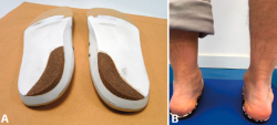 Figura 3. Las plantillas pueden mejorar a la mayoría de los pacientes con un pie plano valgo. A: un gradiente supinador adecuado en la región del retropié es fundamental para conseguir frenar la pronación tarsiana patológica; B: el gradiente supinador y el soporte de arco medial deben probarse en el paciente para comprobar el cambio mecánico y su magnitud.