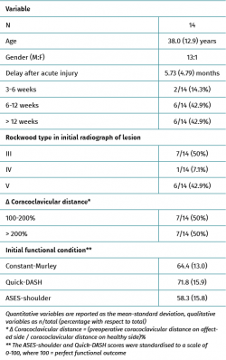 The postoperative radiographic control evidenced correct reduction of the joint, with a restored coracoclavicular distance in 12 patients (85.7%); two subjects presented insufficient reduction but which was considered acceptable (43% and 54% increase in coracoclavicular distance).