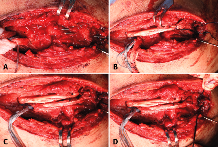 Deep dissection is carried out with an electric scalpel, performing careful haemostasis, starting medially and reflecting the trapezoidal fascia with the instrument (Figure 1B and 1C). It is especially important to adequately identify and isolate this fascia and even place some sutures in it at this stage of the procedure, as they will be of help in performing adequate final repair. As dissection progresses laterally, we must identify and protect the remnants of the anterior and posterior AC ligaments, which almost always remain anchored to the acromion and can be identified under the distal clavicle, interposed between the acromial and clavicle joint surfaces (Figure 1D). These ligaments are essential for achieving adequate repair of the AC joint, and are usually identified even in individuals with lesions that have been present for years. In the next step we identify the coracoclavicular interval following the vertical line from the insertion of the conoid and trapezoid ligaments in the lower surface of the clavicle and palpating the tip of the coracoid process. A split is then made of the tissues between the clavicle and coracoid process, and we clean the lower surface of the latter in order to correctly pass the graft.