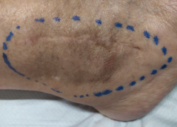 The treatment zone should be identified with a permanent ink marker (Figure 1). This zone is then marked on the plastic patch protector, facilitating trimming of the patch surface to be used for treatment.