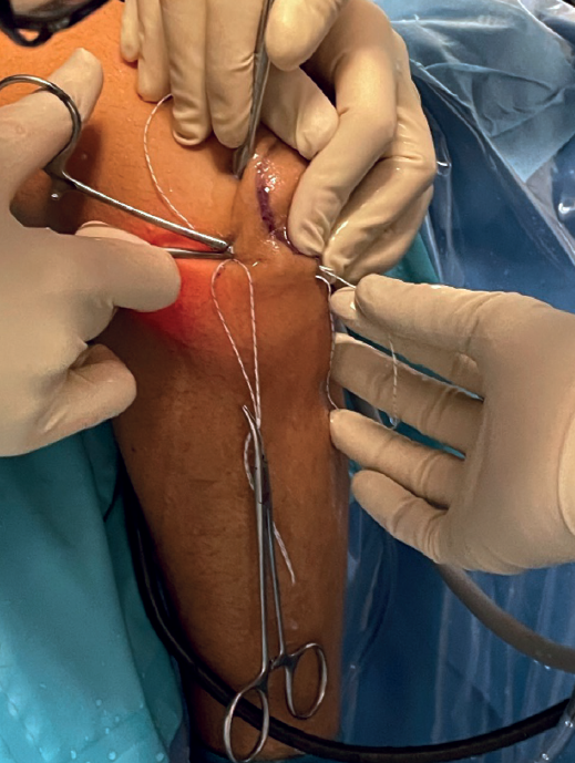 At this point we will have two sutures exiting through the soft spot; we will knot them together (Figure 4) to recover them by pulling on the suture located at the origin of the LCL. In this way we will have a single intra-articular suture extending from the insertion to the origin of the LCL, exiting through the skin in both places (Figure 5).
