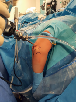 The arthroscope is removed from the joint, and the two ends are sutured separately, taking care to bury the knots as deep as possible at subcutaneous level.