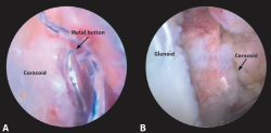 Figure 6. A: the nitinol wire is knotted to the blue-white suture of the implant; B: with the camera positioned in the posterior portal, the nitinol wire acts as an implant suture passer to position the metal button on the upper surface of the coracoid.