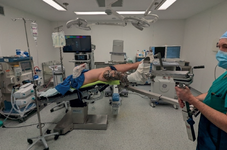 The patient is placed in supine decubitus on the traction table. The entire surgical team is positioned on the side where the operation is to be performed. This will provide a closed sterile area to work in (Figure 2).