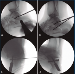 Figura 4. A: control de escopia intraoperatoria (perfil) de la lesión reducida con ayuda de periostotomos; B: control de escopia intraoperatoria (perfil) tras insertar la primera aguja mientras se mantiene la reducción con un periostotomo; C: control de escopia intraoperatoria (axial de calcáneo) tras insertar la primera aguja mientras se mantiene la reducción con un periostotomo; D: control de escopia intraoperatoria (axial de calcáneo) tras colocación del primer tornillo de osteosíntesis.