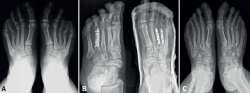 Figura 2. Paciente de 13 años con braquimetatarsia múltiple bilateral. A: radiografía simple en proyección dorsoplantar en carga previa a la cirugía donde se aprecia acortamiento congénito del cuarto metatarsiano del pie izquierdo y de los metatarsianos tercero y cuarto del pie derecho; B: radiografía simple en proyección dorsoplantar tras cirugía de alargamiento agudo con injerto autólogo de peroné y fijación con placas bloqueadas. Se observa zona de retardo de la consolidación en el pie izquierdo; C: radiografía simple en proyección dorsoplantar tras la retirada de las placas al año de la cirugía.