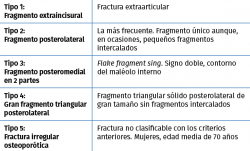 La clasificación de Haraguchi(13) (Tabla 1), publicada en 2006, ha sido la primera clasificación basada en imágenes de TC, diferenciando 3 tipos: la fractura posterolateral oblicua, la fractura con extensión medial y la pequeña fractura cortical del MP. La limitación de esta clasificación es que usa únicamente secciones transversales de TC, sin reconstrucciones bi- o tridimensionales.
