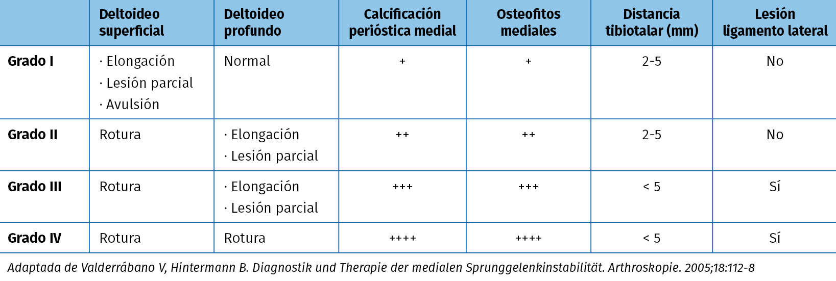 En la Tabla 1, se expone la clasificación de la inestabilidad medial de tobillo obtenida mediante artroscopia(5).