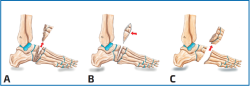 Figura 2. Diversos tipos de osteotomía descritos para el tratamiento del pie cavo anterior. A: técnica de Japas; B: Akron/Myerson; C: técnica de Jahss.