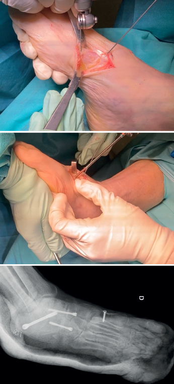 Aprovechando la fijación provisional con las agujas, suele ser preferible la fijación final con tornillos (Figura 2E). El tamaño, el tipo y la cantidad de tornillos son preferencia del cirujano. La fijación medial dependerá del acceso al navicular. Se puede realizar con tornillos por vía percutánea y, si fuera necesario mejorar la estabilidad, se puede añadir una placa dorsal a la articulación talonavicular que se intenta fusionar.