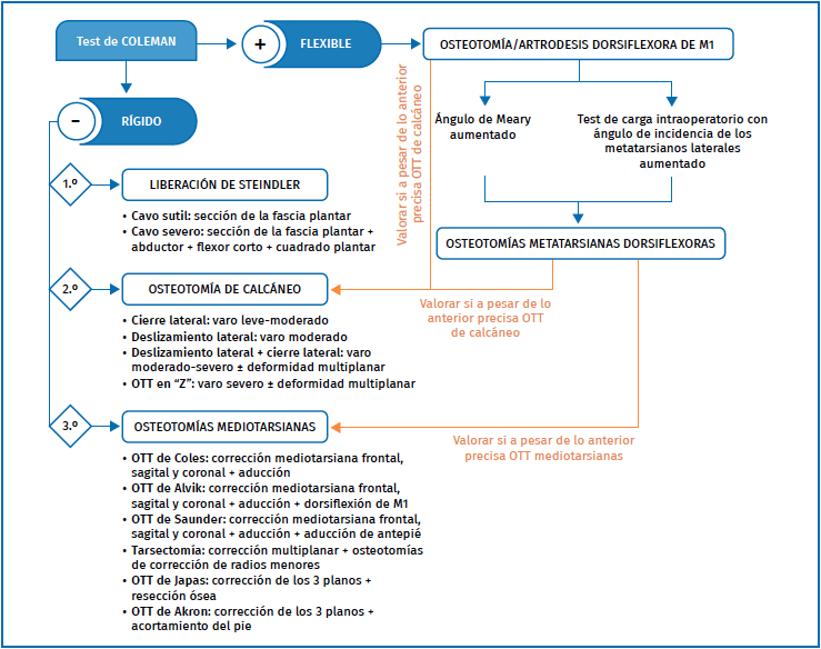 El tratamiento del PCV presenta un alto grado de complejidad. Tal y como se recoge en varias secciones de la monografía y de la literatura al respecto, en el pie cavo la cirugía tiene que ser individualizada y secuencial. Valoraremos cada caso como un caso único tomando las decisiones oportunas, realizando una cirugía a la carta. El algoritmo de la Figura 5 recoge unas directrices básicas con las cuales podemos orientar el tratamiento de cada caso.