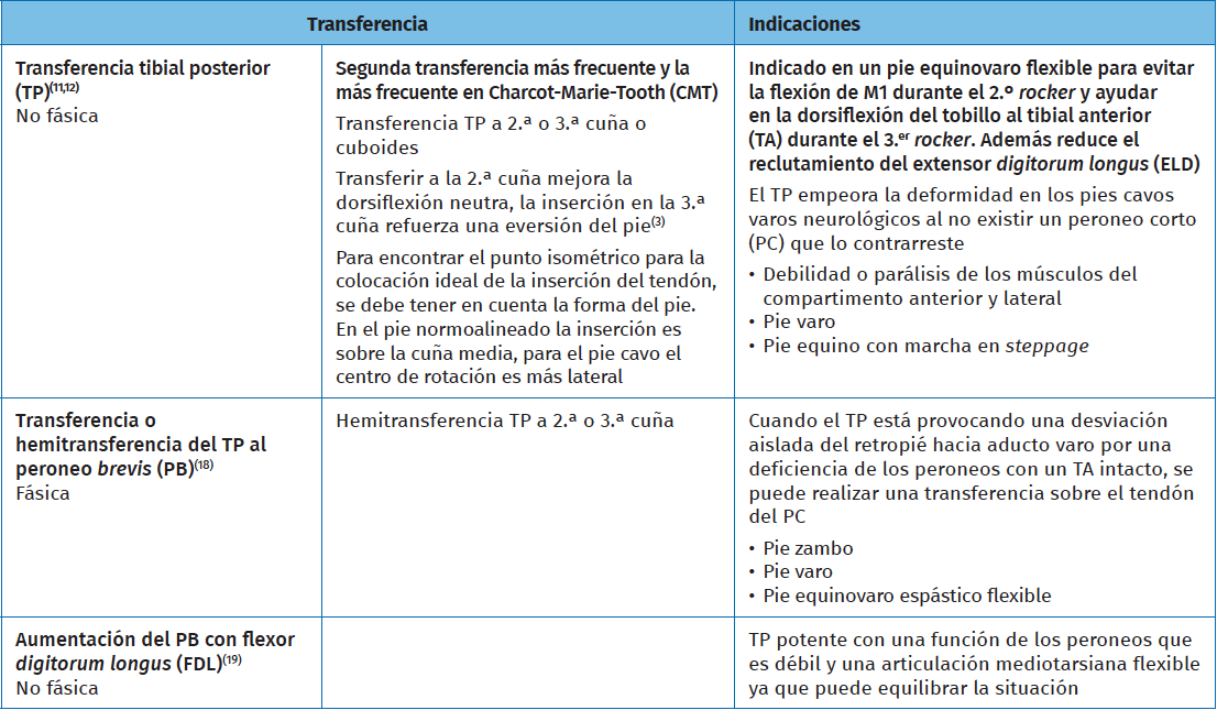 Las transferencias tendinosas son complementarias al tiempo óseo, pero no servirán de mucha ayuda si no se consigue un pie plantígrado y actúan sobre las referencias óseas en una correcta orientación espacial. Las osteotomías y las artrodesis solo aguantarán si se restablece el equilibrio muscular(4).