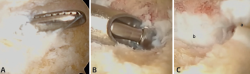 Figura 7. Caso de resección artroscópica de una coalición calcaneoastragalina (CA) (caso e imágenes cedidas por el Dr. Vicente Vicent Carsí). A: en otras ocasiones de coalición en la carilla medial hemos utilizado un portal medial accesorio para extirpar la coalición CA; B: extirpación de la barra con fresa desde el portal medial. Desde este la extirpación de la coalición es más sencilla, pero la posibilidad de lesionar la rama medial del nervio tibial posterior es alta; C: finalización de la extirpación. a: articulación subastragalina posterior; b: barra extirpada.