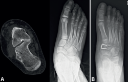 Figura 8. A: niña de 13 años. Tomografía computarizada mostrando coalición calcaneoastragalina, pie plano valgo abducto; B: radiografía tras la resección de la coalición y osteotomía de Mosca + osteotomía de sustracción plantar de la primera cuña.