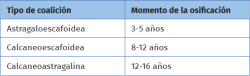 La unión entre los huesos del tarso en el recién nacido y niños pequeños es fibrosa o cartilaginosa, permitiendo cierto movimiento. Estos tejidos no contienen estructuras nerviosas que transmitan dolor, lo que explica que los pacientes en la primera infancia rara vez presenten síntomas. A medida que el niño crece, estas uniones comienzan a osificarse (Tabla 1). Cuando la unión se osifica, se forma un periostio y una cápsula alrededor de la coalición, con estructuras nerviosas capaces de transmitir dolor. Además, la falta de movimiento en esta zona concentra mayores presiones, lo que puede llevar a fenómenos de estrés y microfracturas, siendo otra causa potencial de dolor(2).