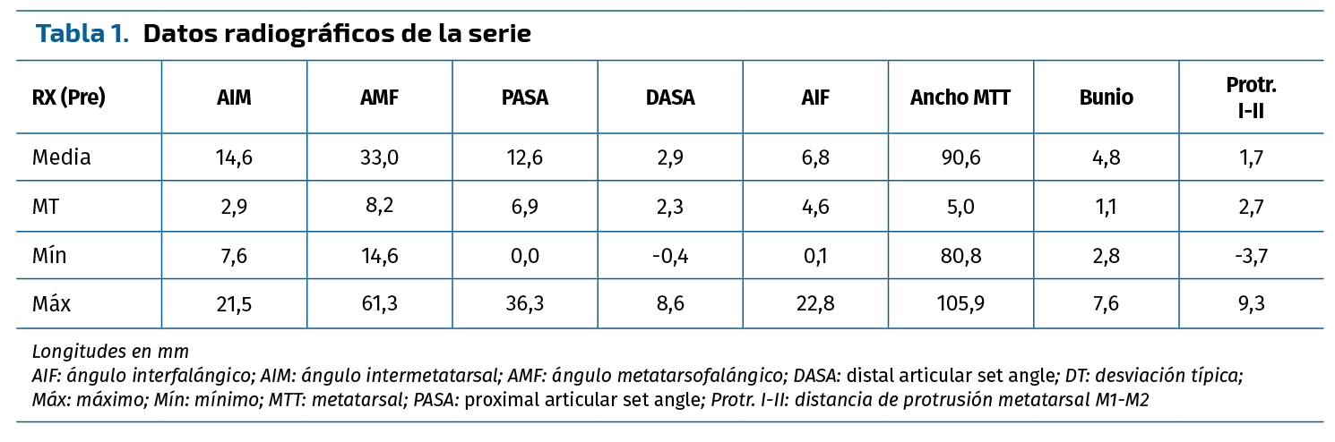 Ochenta pacientes fueron mujeres (93,0%) y 6 varones (7,0%), con una edad media de 57,8 años (DS = 15,1). La edad media de las mujeres fue de 58,9 ± 14,9 años (rango: 17-84) y la de los hombres, de 53,5 ± 17,2 años (rango: 32-77). El 34,9% de los pacientes estaba en situación laboral activa en el momento de la primera entrevista. Todos los pacientes refirieron dolor antes del tratamiento: moderado (escala visual analógica –EVA– = 5-7) el 53,5% y grave (EVA = 8-10) el 43,0%. El 52,3% de los pies tenían una fórmula metatarsal de tipo plus-minus y el 72,1% de tipo pie egipcio. El tipo de cabeza predominante en el primer metatarsiano fue la cabeza redonda, con un 61,7%. El 60,5% de los pies fueron plantígrados, el 3,5% cavos y el 36,0% planos, en función de criterios radiográficos. Los valores radiográficos de los pies de los pacientes de la serie se reflejan en la Tabla 1.