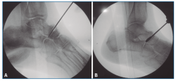 Figura 1. Cruentación de la articulación astrágalo-escafoidea, bajo control fluoroscópico, hasta tejido subcondral, con escoplos (A) y brocas motorizadas (B).