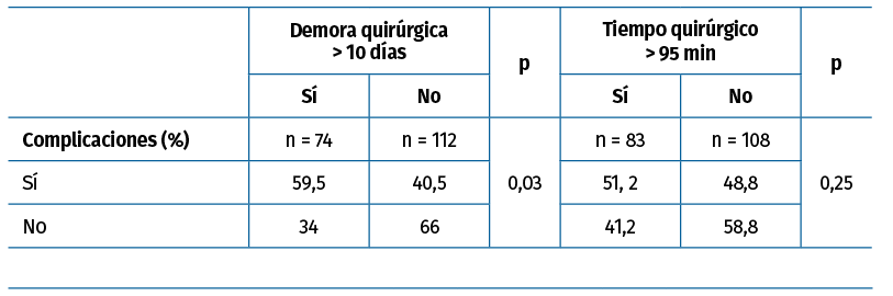 El abordaje lateral ampliado presentó menor porcentaje de neuralgia que el grupo de otros (p < 0,05). No obstante, y pesar de ausencia de relación entre tiempos operatorios y riesgo de complicaciones, los pacientes con demoras quirúrgicas de más de 10 días padecieron más efectos adversos que los que no sufrieron demora (p = 0,03). Aunque el grupo de artrodesis primaria tuvo tasas más elevadas en cuanto a retardo de cicatrización de la herida, infección o SDRC, y un mayor porcentaje de complicaciones globales (4,5%) en relación con el grupo tratado mediante síntesis de la fractura, la relación no fue significativa (p = 0,34). Por otro lado, la utilización de injerto durante el acto quirúrgico se correlacionó con el retardo de cicatrización de la herida (p = 0,003). (Tablas 4 a 6).