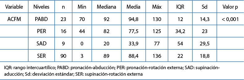 Tabla 1. Valores del ángulo crurofocal medial (ACFM) según la clasificación de Lauge-Hansen; valor de p por test de Kruskal-Wallis.