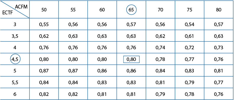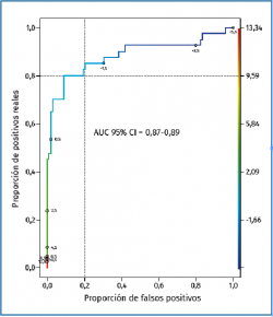 Se buscó otro modelo alternativo más sencillo e intuitivo, basado exclusivamente en la influencia del ángulo y el ECTF. También con validación cruzada, se obtuvo que la media del porcentaje de pacientes correctamente clasificados mediante este modelo fue de 0,86 (86%; desviación estándar: 0,044) (Figura 4 y Tabla 2) y con análisis discriminante es de 0,84 (84%) con desviación estándar de 0,046.