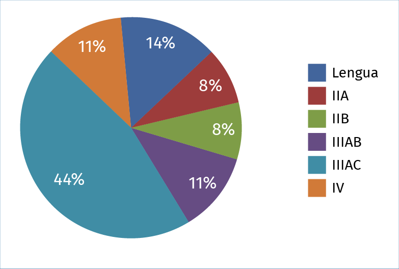 Se han recogido datos sobre un total de 36 casos (29 pacientes) con un seguimiento medio de 42,9 meses (DS: 24,9) y una edad media de 42,6 años (DS: 12,1). El 13,9% (5) son fracturas en lengua; 8,3% (3) Sanders de tipo IIA; 8,3% (3) IIB; 11,1% (4) IIIAB; 44,4% (16) IIIAC; y 11,1% (4) IV (Figura 1). El tipo de síntesis realizado ha sido con placa en 32 casos y con tornillos percutáneos en 4 casos.