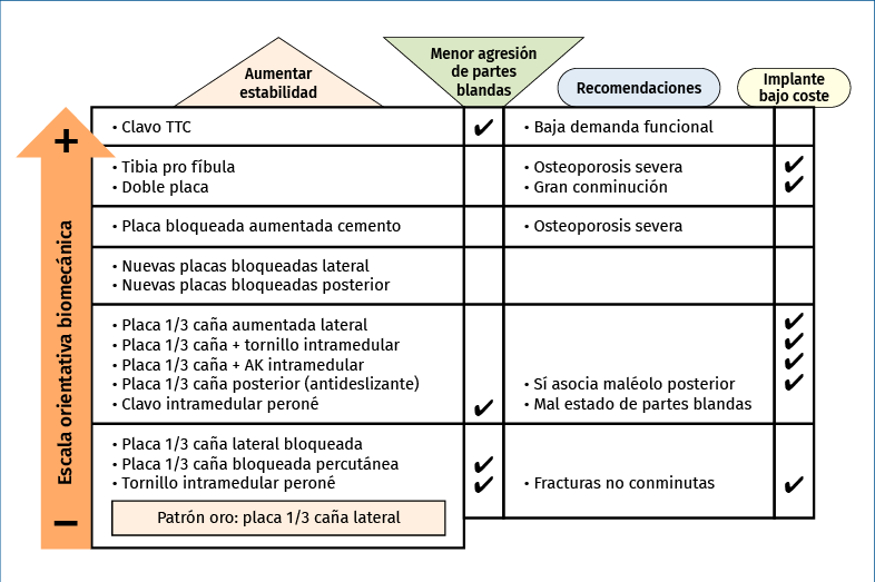 Este artículo revisa las diferentes opciones de tratamiento en las fracturas osteoporóticas de tobillo, así como las condiciones específicas de diabetes y neuropatía. En la Figura 2 se resumen las diferentes opciones de tratamiento, basándonos en una escala orientativa biomecánica, agresión de partes blandas y recomendaciones de los autores.
