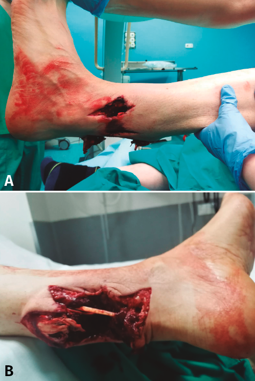 Se trata de un paciente varón de 49 años que presentaba una fractura abierta de peroné de tipo IIIB de Gustilo y Anderson tras sufrir un accidente por arma de fuego. Se observa defecto cutáneo de unos 10 cm en la región posterior de la pierna izquierda (Figuras 1A y 1B). En la radiografía se aprecia una fractura del tercio distal del peroné sin afectar a más estructuras óseas (Figura 2).