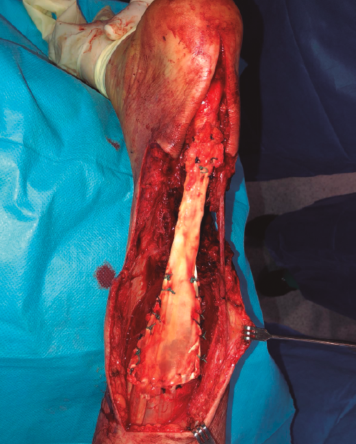 La fijación se obtuvo a través de una sutura de tipo Krackow en la unión miotendinosa proximal y sutura término-terminal a nivel distal, al existir muñón distal suficiente (Figura 5). De forma simultánea, se realizó la cobertura cutánea con un colgajo fascio-cutáneo vascularizado del muslo del paciente (Figuras 6A, 6B y 6C).