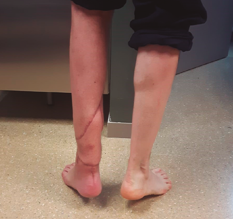 Tras el alta hospitalaria, comenzó la rehabilitación, iniciando ejercicios pasivos de dorsiflexión y flexión plantar.