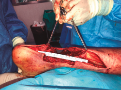 Se objetivó un defecto de 15 cm en el tendón calcáneo (Figura 3). Se aproximaron los bordes de la herida con seda quirúrgica y se realizó un vendaje compresivo.