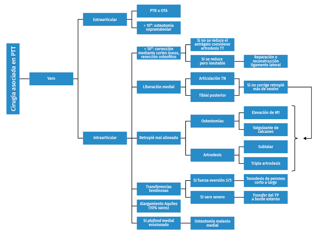 Figura 3. Algoritmo de opciones quirúrgicas en el paciente con deformidad en varo. M1: primer metatarsiano; OTA: osteotomía tibial alta; PTR: prótesis total de rodilla; TN: talonavicular; TP: tibial posterior; TT: tibiotalar.