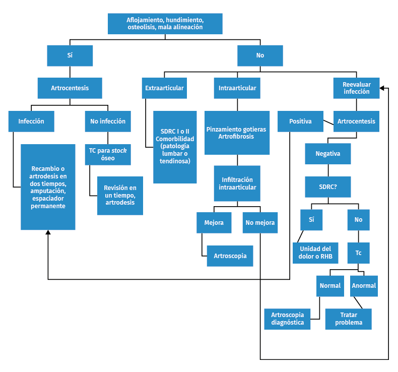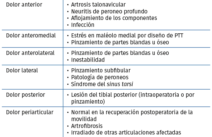 La revisión en 2 tiempos comienza con la retirada del implante y la sustitución por un espaciador de cemento con antibiótico y antibioterapia por vía parenteral durante 6-8 semanas. Posteriormente, una vez normalizados los exámenes analíticos, puede procederse al recambio por una nueva PTT, por la artrodesis o, en caso de mala evolución, por una amputación infracondílea. En algunos casos de baja demanda funcional, el espaciador de cemento puede ser dejado como tratamiento definitivo. - Pinzamiento (impingement): el tratamiento debe adaptarse a cada una de las posibles causas (Tabla 6).