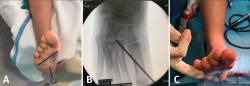 Se realiza por un abordaje medial, evitando lesionar la arteria pedia y el nervio peroneo profundo. Tras realizar una cuña de base plantar y medial, se realiza la artrodesis parcial correctora en aducción y pronación de la columna medial (Figura 15A).