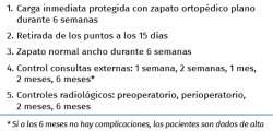 La cirugía se realiza con raquianestesia o bloqueo locorregional de la pierna, acompañados de isquemia distal a la rodilla, y consiste en un primer tiempo de partes blandas distales (buniectomía, sección aductor, plicatura capsular final) y osteotomía proximal (cierre o apertura) con sierra oscilante. Después, se intenta una osteoclasia sin desplazamiento para, posteriormente, forzar la posición de flexión plantar del primer metatarsiano ayudándose, si es preciso, de una fijación transitoria con una aguja de Kirschner (entre el primer y el segundo metatarsiano). Para la síntesis, se utiliza una placa de escalón en las osteotomías de apertura y 2 tornillos de 2,6 mm en las de cierre (excepto en 2 casos en los que se utilizaron placas). Por último, se coloca vendaje estándar de antepié permitiendo la carga inmediata con zapato ortopédico rígido plano sin tacón durante 6 semanas. Los detalles postoperatorios se indican en la Tabla 1.