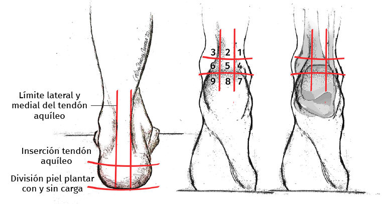Figura 2. Mapa o rejilla sobre la visión posterior del calcáneo: las líneas longitudinales se corresponden con los bordes medial y lateral de la inserción del tendón de Aquiles. La línea horizontal superior se corresponde con el límite inferior de la inserción del tendón de Aquiles y la línea horizontal inferior con la interfase de piel plantar y del talón.