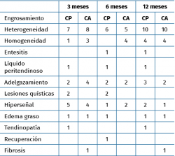 Los hallazgos en las RM y las ecografías de control se encuentran recogidos en las Tablas 1 y 2. En la Figura 3 podemos observar el característico engrosamiento tendinoso durante la evolución postoperatoria. Las complicaciones postoperatorias quedan recogidas en la Tabla 3.
