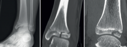 Figura 3. Imágenes radiográficas donde se ve una fractura triplanar. En la proyección lateral simula una fractura de Salter-Harris de tipo II, mientras que en la proyección coronal tiene apariencia de una fractura de tipo III o una fractura de Tillaux. Con la tomografía se puede apreciar con detalle el trazo de fractura y el desplazamiento.