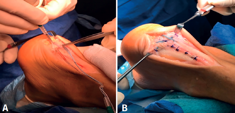 Por último, la reinserción tendinosa se realizó con el sistema SpeedBridge® de Arthex (Arthrex Inc., Naples, FL, EE. UU.) intentando hacer coincidir el extremo distal del tendón con las marcas medial y lateral realizadas previamente (Figura 2). Tras el cierre del paratendón y la piel, se colocó férula posterior suropédica con el tobillo a 90°.