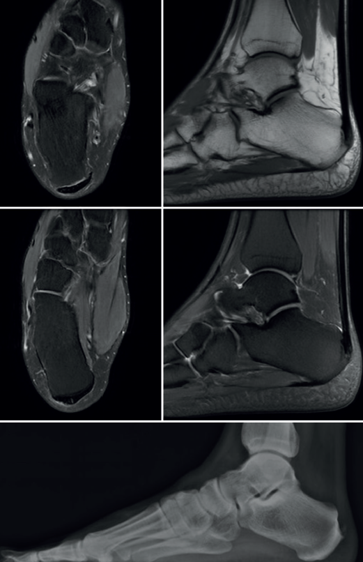 Figura 1. Estudio radiológico que incluye resonancia magnética del tobillo y radiografía del pie del participante con tendinopatía insercional de Aquiles crónica.