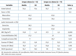 Se compararon las características demográficas, la fuerza de FP y dorsiflexión del tobillo lesionado y la FAOS entre los grupos de obesos y no obesos.
