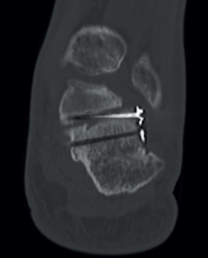 Figura 5. Control de un paciente intervenido por abordaje del seno del tarso con un tornillo intraarticular en mala posición.
