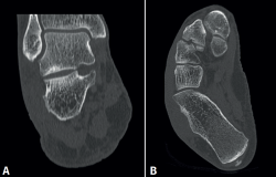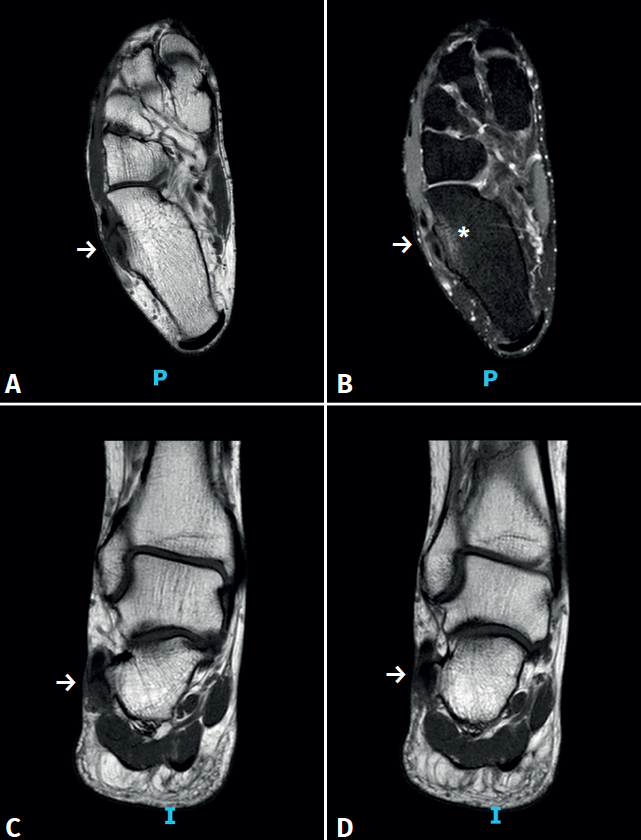 Se solicitan radiografías con carga que evidencian la presencia de un pie cavo varo (Figura 1) y una resonancia magnética sin contraste que muestra una rotura parcial antigua del ligamento talofibular anterior, una exostosis ósea en el borde lateral del calcáneo de 6,2 mm, con edema óseo adyacente y un engrosamiento significativo de un segmento de 3 cm del tendón peroneus longus en relación con la exostosis previamente descrita (Figuras 2 y 3).