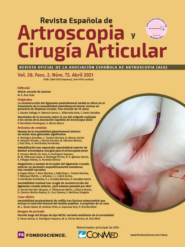 Revista Española de Artroscopia y Cirugía Articular está distribuida bajo una licencia de Creative Commons Reconocimiento-NoComercial-SinObraDerivada 4.0 Internacional.
