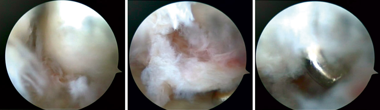 En casos de lesión completa de grado III y IV realizamos desbridamiento artroscópico y fijación interna mediante tornillo percutáneo semilunopiramidal (Figura 9).